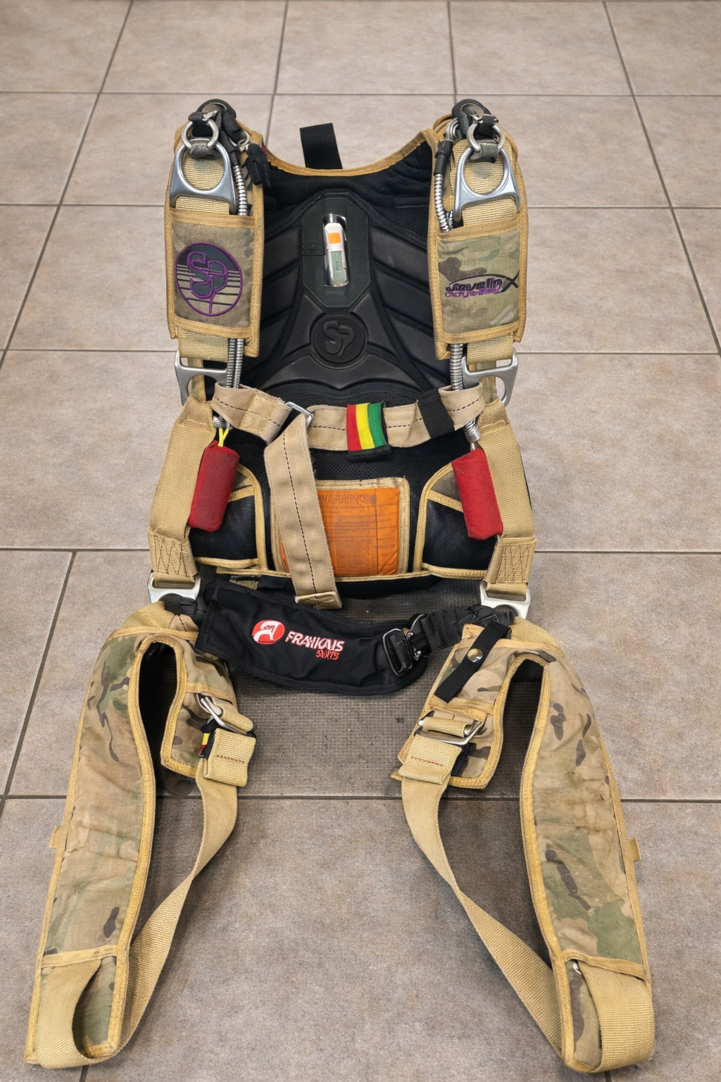 Proper rig fit is essential for maintaining stability during freefall and canopy flight. Because harness dimensions influence comfort and safety, this rig has been configured for jumpers within a specific size range.
