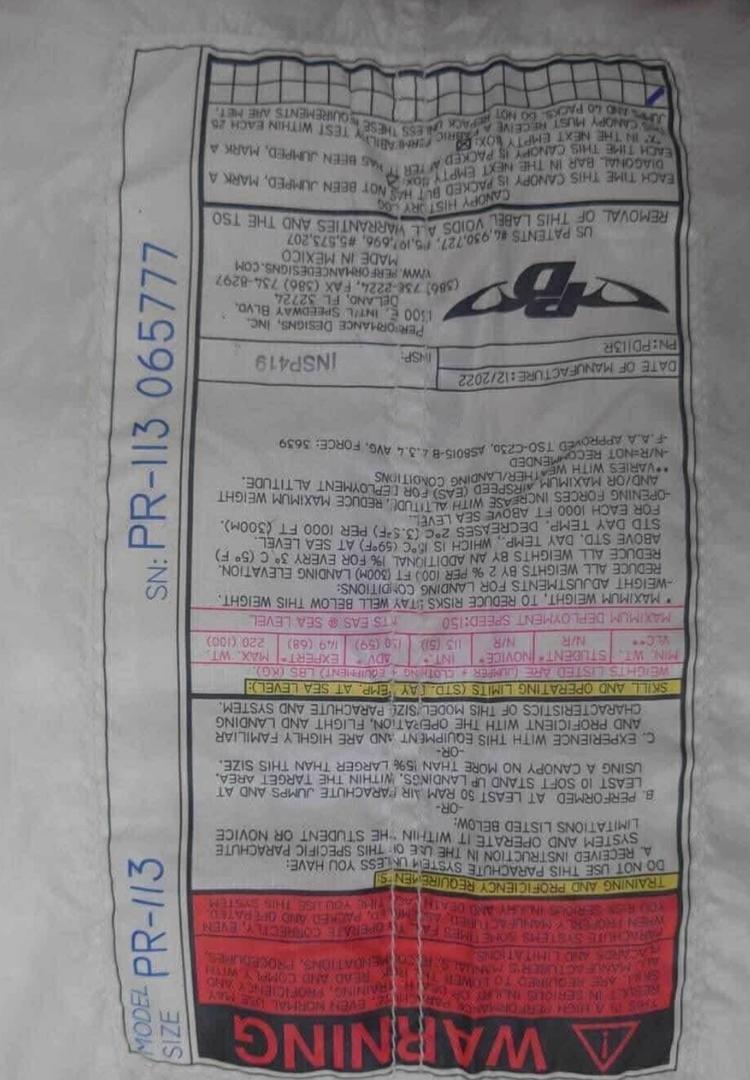 Because the reserve canopy has been manufactured significantly later than the container, extended service life has been preserved. Furthermore, limited usage has contributed to confidence in fabric integrity and line condition.