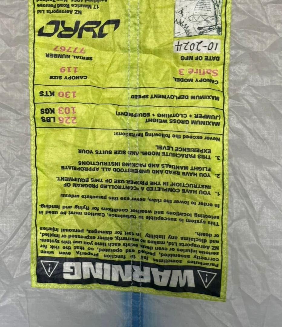 This Used Safire Canopy 3 199 DOM 2024 is presented in excellent condition with approximately 100 jumps recorded. The fabric retains strong structural integrity, and line trim remains within expected tolerance for its jump count. Additionally, there are no patches, holes, tears, or prior repair work on the canopy, ensuring the material profile remains consistent throughout all cells and panels. This condition level reinforces long-term value, supports confident flight characteristics, and positions the equipment as a reliable purchase for pilots seeking a lightly used wing with verifiable care history.
