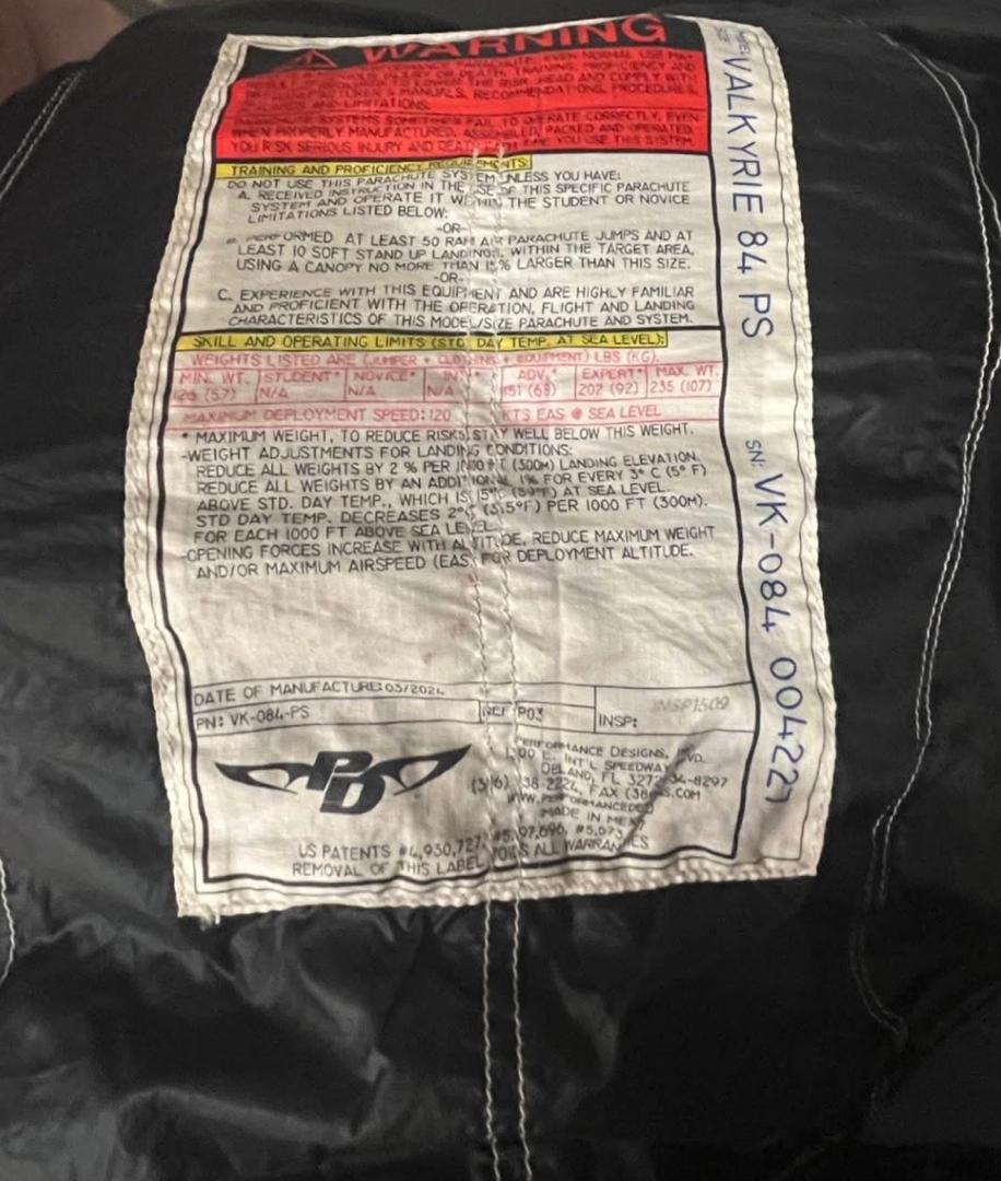 Because this Valkyrie 84 has been stored responsibly and inspected regularly, it offers the confidence and longevity that experienced skydivers expect from a premium high-performance canopy. Therefore, you can move forward knowing that this wing delivers durability, safety, and exceptional value within the used-gear market.