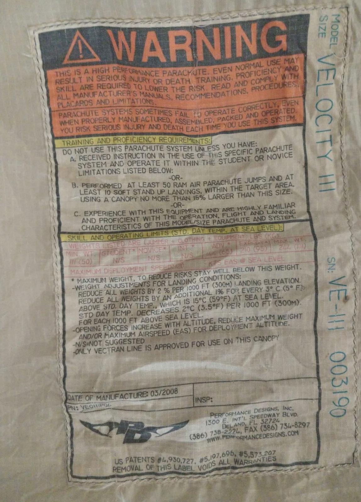 Continued airworthiness remains dependent on future repacks and inspections, which should always be completed by a certified rigger.Used Vector 3 V08 Complete Rig