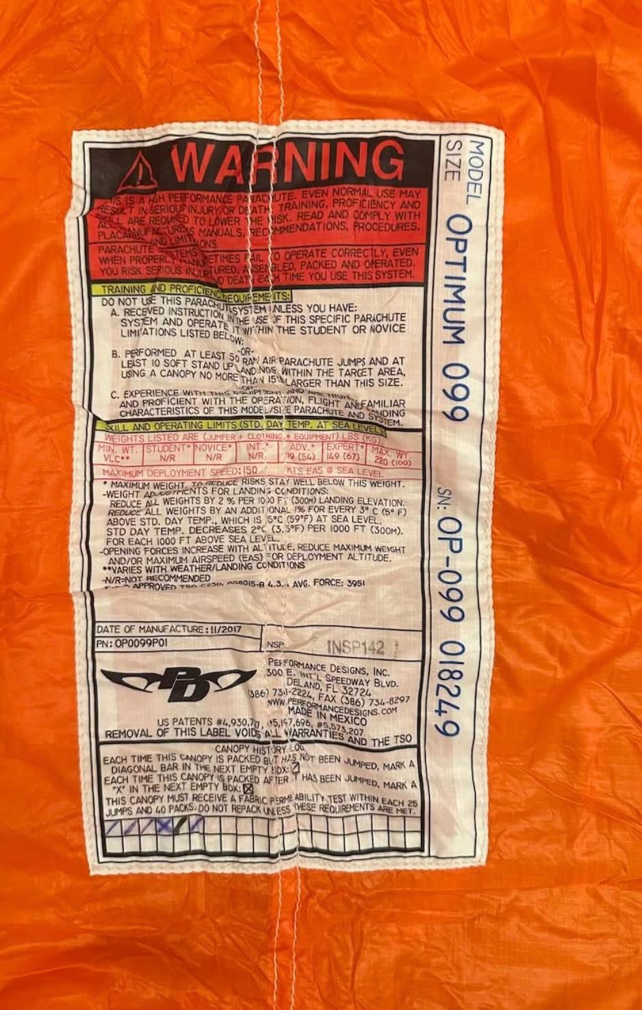 Redundancy remains a non-negotiable aspect of any skydiving system. Accordingly, this rig is fitted with a Performance Designs Optimum 99 reserve, a canopy recognized for its low pack volume and dependable performance.