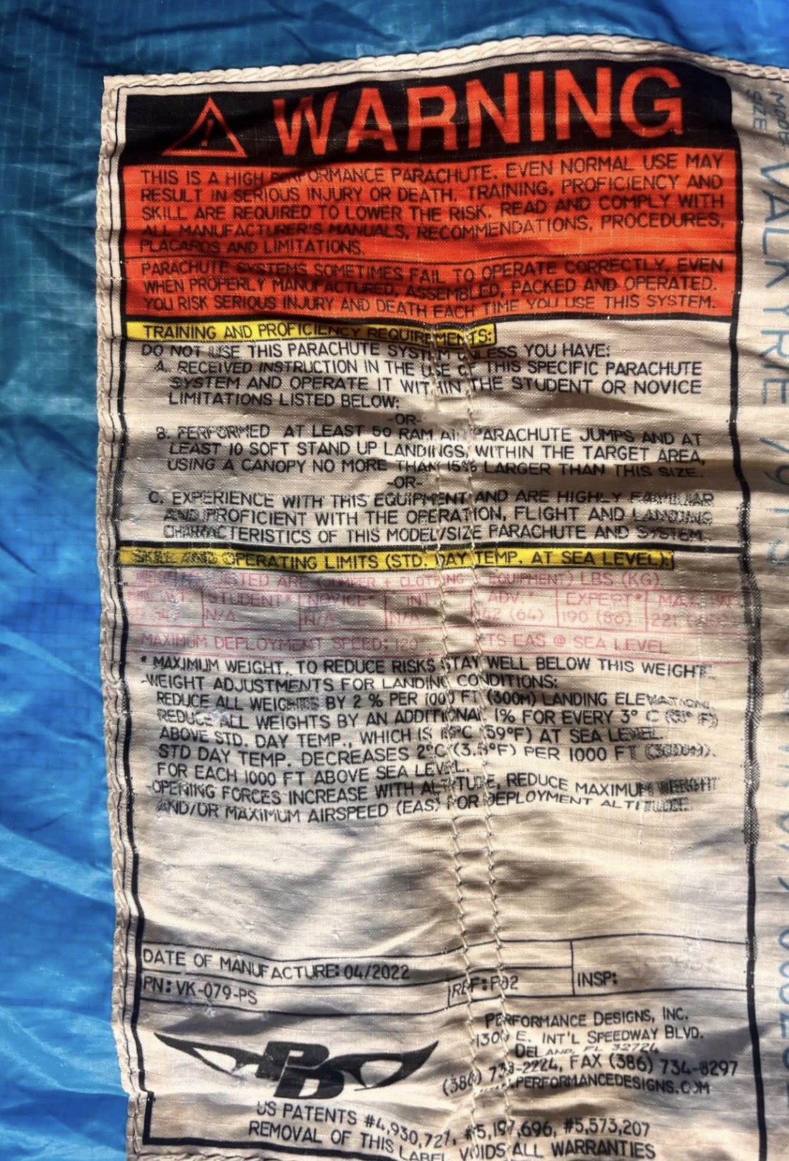 Used Valkyrie Main Parachute Canopy 79 Materials, Handling, and Advanced Flight Control